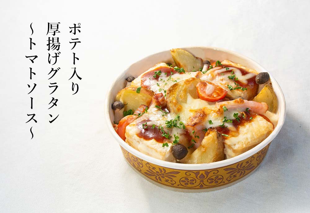 厚揚げ惣菜 絹厚揚げと卵のオイスターソース炒め 絹厚揚げとえびのビーフン たっぷりきのこのアンチョビガーリック炒め 絹厚揚げとたこのアンチョビガーリック炒め ブロッコリーとベーコンの厚揚げグラタン きのこと厚揚げグラタン〜デミグラスソース〜 ポテト入り厚揚げグラタン~トマトソース~ かぶとベーコンの厚揚げグラタン ~デミグラスソース~