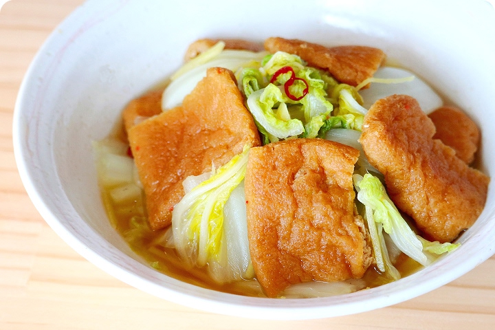 くたくたになるまで煮た白菜と「おだしがしみた油揚げ」が互いの旨みを吸い合い、噛むごとにじゅんわり旨みが広がります!白菜の甘みが増す寒い季節にぜひ。