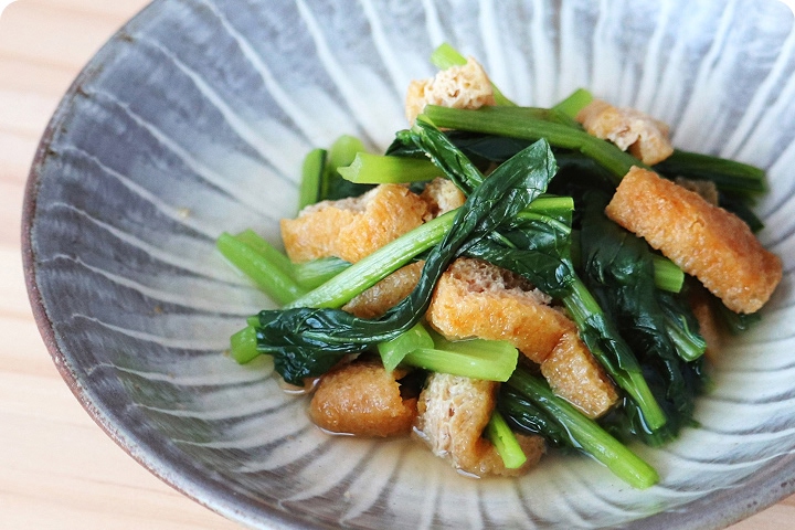 小松菜の煮びたし味付けはおだしがしみたきざみあげと一つまみの塩だけで、ほんのり甘辛のやさしい味わいの煮びたしが出来上がり!電子レンジ調理でできる、超簡単で楽ちんのスピードメニューです!