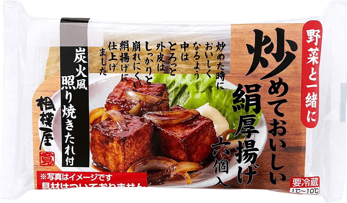絹厚揚げの新定番「炒め物」メニューをご自宅で手軽においしく楽しんでいただけるよう、炒め物専用につくりあげた絹厚揚げと調味ソースをセットにした商品です。炒めた時においしくなるよう、中はとろッと、外皮はしっかりと崩れにくい絹厚揚げに仕上げました。全ての面で皮のおいしさを味わっていただけるサイコロ状の絹厚揚げで、少し分厚く仕上げた皮はソースとの馴染みも抜群。調味ソースは定番人気の照り焼きたれをベースに炭火の風味を加えており、フライパンで炒めた時に醤油感と炭火の風味で食欲そそる味わいに仕上げています。調味の手間や失敗なく、美味しい絹厚揚げの炒め物を楽しんでいただける一品。お好みの野菜をプラスするのもおすすめです。