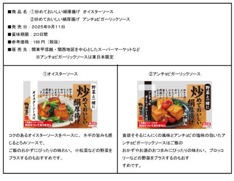 絹厚揚げは、炒めた時においしくなるよう、中はとろッと、外皮はしっかりと崩れにくく仕上げています。全ての面で皮のおいしさを味わっていただけるようにサイコロ状につくりあげ、ソースとよく馴染むように皮を少し分厚く仕上げました。調味ソースはコクのあるオイスターソースと、食欲そそるにんにくの風味とアンチョビの塩味の効いたアンチョビガーリックソースの2種類で、調味の手間や失敗なく、ご飯にもお酒にも合う味わいに仕上がります。小松菜やブロッコリーなどの野菜と一緒に炒めるとよりおいしくいただけるようにつくりあげており、厚揚げの炒め物メニューの幅を広げます。