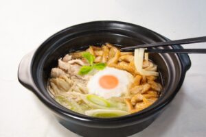 - 鍋スープの材料を土鍋に入れ、火にかける。