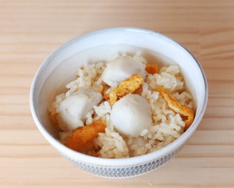 - 米は洗って炊飯器の釜に入れ、2合分の水を加えて20分ほど置いた後、おだしがしみたきざみあげを加え、さらに10分ほど置いておく。