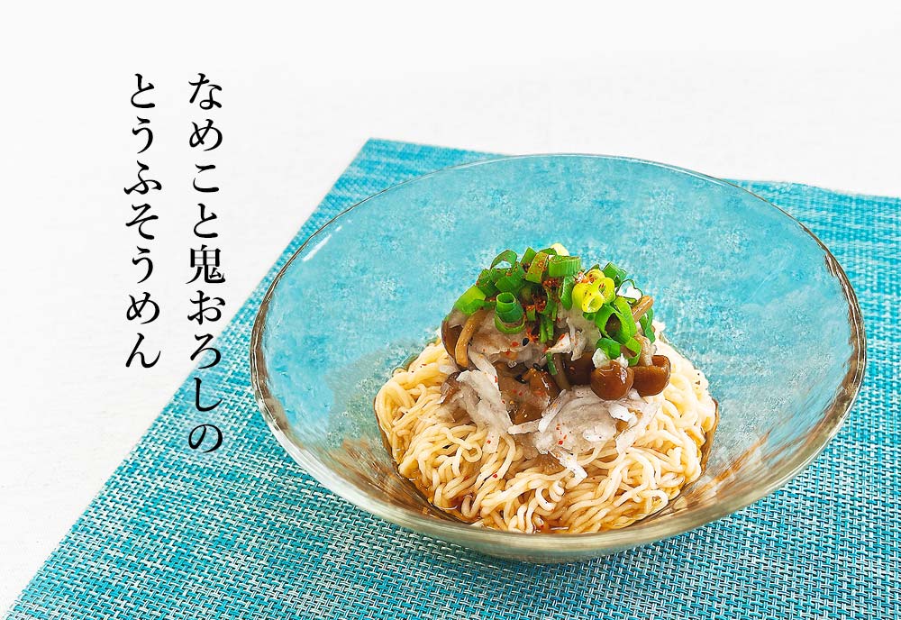 とうふ麺 冷やし坦々風冷麺 高菜の和風冷麺 たこときゅうりの酢の物のせ冷麺 もずく酢のサッパリとうふ麺 茹でいかと塩昆布のすだち冷麺 さばの水煮のせすだち冷麺 焼き豚そうめん 豚バラとろろのせ 柴漬け納豆めん なめこと鬼おろしのとうふそうめん 海鮮とうふビビン麺 ちくわと長ネギのとうふビビン麺